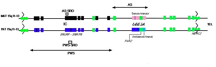 | Figura1. Genetic map of human chromosome 15q11-q13. The translocation breakpoint clusters (zigzag line) associated with chromosome 15q11-q13 deletions, the critical PWS and AS regions (arrows) and the essential imprinting elements (AS-SRO and PWS-SRO) are shown. Maternal and paternal chromosomes are indicated. Genes expressed from the maternal allele are shown as pink boxes. Paternally expressed alleles are indicated by blue boxes. The silent, non-expressed allele is shown as a black box. Non-imprinted genes (i. e. expressed from both alleles) are in green. Imprinting of UBE3A, the sense transcript and the antisense transcript are tissue-specific. In the brain, the UBE3A and the sense transcript are expressed from the maternal allele while the antisense transcript is transcribed in the opposite orientation from the paternal allele. Other tissues do not express the antisense transcript but express UBE3A biallelically. The size of the antisense transcript has yet to be determined (light blue). PAR2 is contained within the UBE3A gene (10, 41). The expressed HERC2 pseudogenes are indicated by circles. | ||